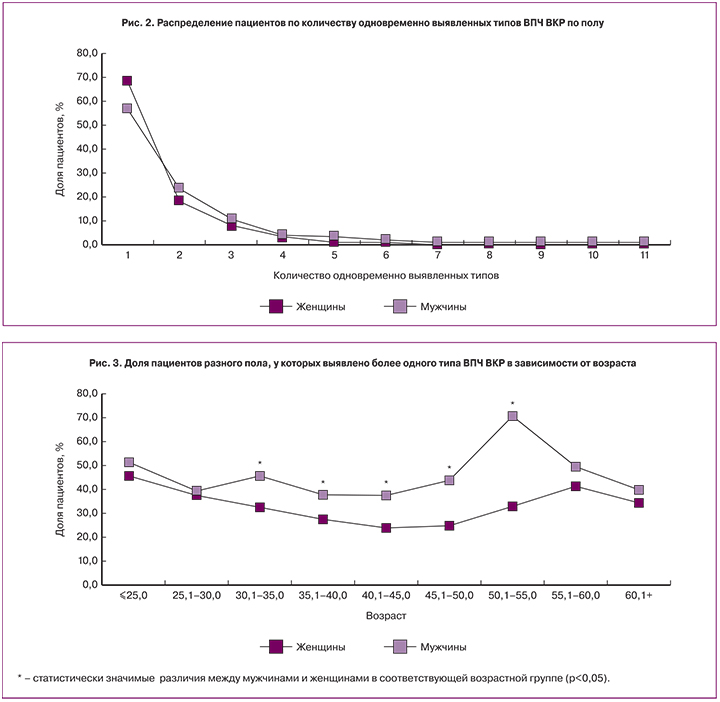 Распределение пациентов по количеству выявленных типов ВПЧ ВКР существенно не различается между мужчинами и женщинами (рис. 2), а также между пациентами из разных возрастных групп и разной территории проживания.
