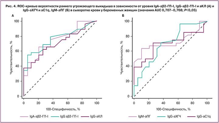По данным ROC-анализа, определение IgG- и IgA-аβ2-ГП-I, IgG-аКЛ, аХГЧ и аC1q, IgM-аПГ характеризовалось высокими показателями чувствительности, специфичности, AUC и положительной прогностической значимости в отношении раннего угрожающего выкидыша (табл. 3); показатели точности тестов составляли от 60% до 67%. Следует отметить, что, по данным ряда авторов, определение IgA-аβ2-ГП-I характеризуется более высокой чувствительностью для диагностики АФС, чем определение классических IgM-аβ2-ГП-I и аКЛ [16, 17].