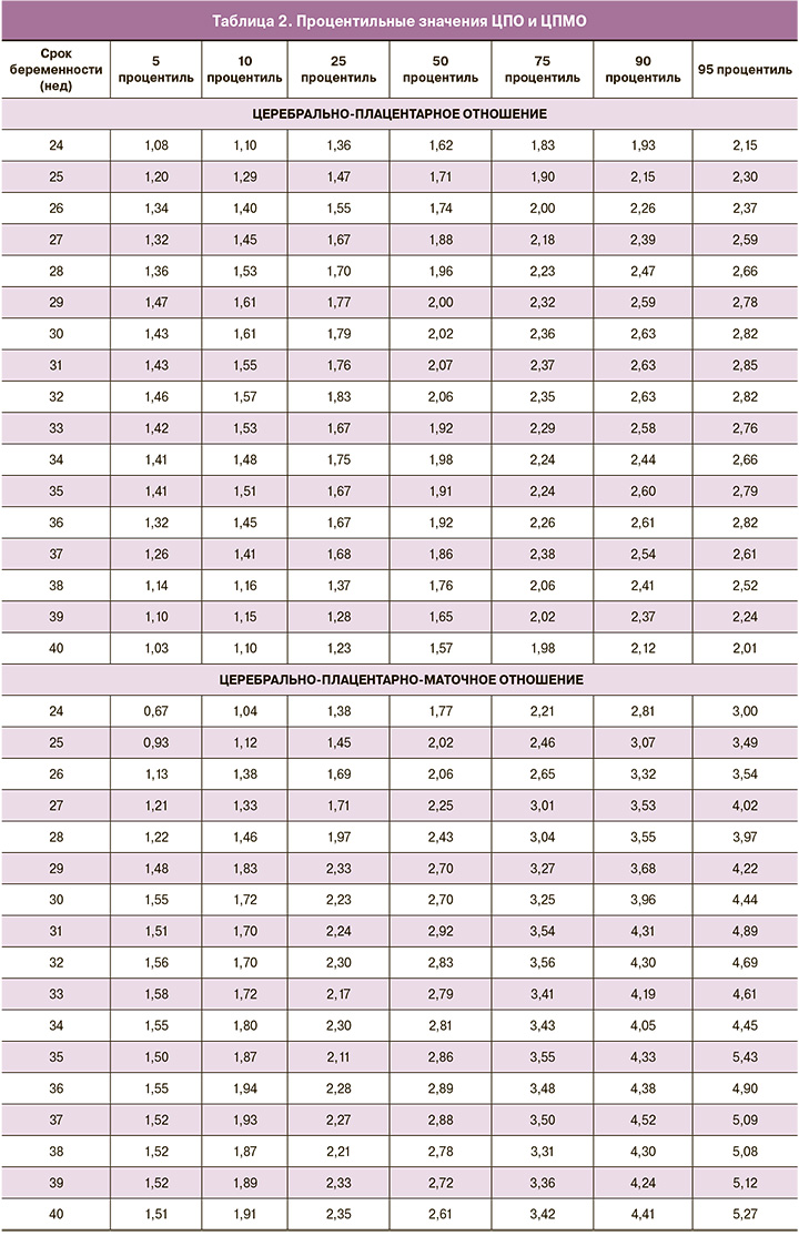 Для создания процентильных интервалов ЦПО и ЦПМО, приведенных в таблице 2, использованы результаты 1639 допплеровских исследований только пациенток 2-й (контрольной) группы, дети которых при рождении имели вес ≥10 процентиля. Сравнение полученных на собственной группе процентильных интервалов ЦПО с референсными интервалами ЦПО-ФМФ [30] выявило значительное совпадение: различия между показателями 5 процентиля в соответствующие гестационные сроки составляли от 0,03 до 0,14.