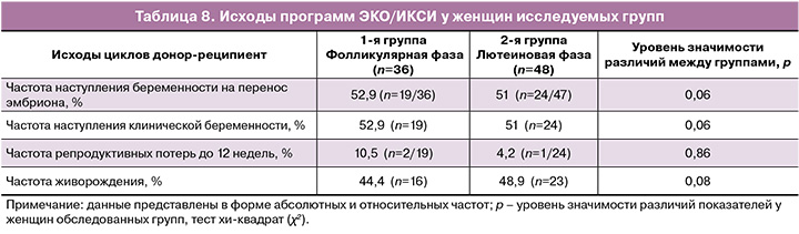 При анализе исходов программ ЭКО/ИКСИ у женщин исследуемых групп не было выявлено статистически значимых различий в частоте наступления беременности, частоте прогрессирующей беременности и частоте живорождения (табл. 8).