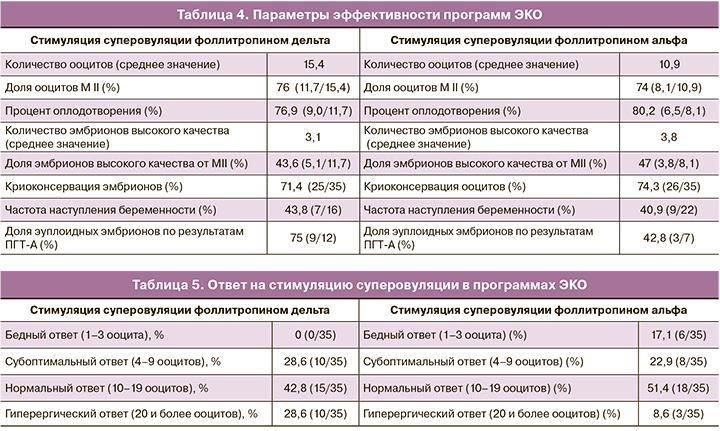 Если говорить о количестве дней стимуляции, то оно было сопоставимо в обеих группах. Стимуляция суперовуляции длилась 11±3 дня в группе фоллитропина дельта и 10±3 дня в группе фоллитропина альфа. При оценке количества полученных ооцитов и ответа яичников нами было отмечено следующее. Количество полученных ооцитов в группе фоллитропина дельта составило 15,4 среди всех стимулированных пациенток, в группе фоллитропина альфа – 10,9, что говорит о более высокой эффективности стимуляции суперовуляции с применением фоллитропина дельта (табл. 4). При этом в группе фоллитропина дельта доля нормального ответа яичников (от 10 до 19 ооцитов) составила 42,8% (15/35) случаев, не было отмечено ни одного случая бедного ответа (1–3 ооцита, р=0,01), доля субоптимального ответа (4–9 ооцитов) составила 28,6% (10/35), гиперергического (20 и более ооцитов, р=0,03) – 28,6% (10/35) случаев. В группе фоллитропина альфа нормальный ответ яичников (10–19 ооцитов) наблюдался в 51,4% (18/35) случаев, бедный и субоптимальный (1–3, р=0,01 и 4–9 ооцитов соответственно) – у 17,1% (6/35) и 22,9% (8/35) пациенток соответственно и гиперергический (20 и более ооцитов) – в 8,6% (3/35, р=0,03) случаев (табл. 5). Несмотря на более высокую частоту гиперергического ответа в группе фоллитропина дельта, риск развития СГЯ наблюдался лишь в 14,3% (5/35) случаев. Стоит отметить, что в группе фоллитропина альфа низкая доля гиперергического ответа связана с тем, что в данной группе пациенток наблюдался бедный ответ на стимуляцию суперовуляции и требовалась коррекция дозировки препарата в 11,4% (4/35) программ ЭКО. Несмотря на низкую долю гиперергического ответа в данной группе, частота риска СГЯ была сопоставима с группой фоллитропина дельта. Из всех полученных ооцитов доля ооцитов качества МII составила 76% (11,7/15,4) в группе фоллитропина дельта и 74% (8,1/10,9) в группе фоллитропина альфа. Процент оплодотворения составил в группах фоллитропина дельта и альфа 76,9% (9,0/11,7) и 80,2% (6,5/8,1) соответственно. При этом количество эмбрионов высокого качества составило 43,6% (5,1/11,7) от числа ооцитов МII в группе фоллитропина дельта и 47% (3,8/8,1) в группе фоллитропина альфа. Частота наступления беременности рассчитывалась на перенос эмбриона в нативном цикле и была равна 43,8% (7/16) в группе фоллитропина дельта, 40,9% (9/22) – в группе фоллитропина альфа. Все беременности были подтверждены клинически, репродуктивных потерь на период проведения исследования зарегистрировано не было. Данных о живорождении на момент окончания исследования еще не получено. Криоконсервация эмбрионов при наличии эмбрионов высокого качества была произведена в 71,4% (25/35) программ ЭКО с использованием фоллитропина дельта и в 74,3% (26/35) программ на фоне стимуляции фоллитропином альфа (табл. 4). В 54,3% (19/35) случаев была произведена отмена переноса эмбриона в цикле стимуляции фоллитропином дельта и в 37,1% (13/35) программ на фоллитропине альфа. В группе фоллитропина дельта отмена переноса была связана со следующими причинами: у 47,4% (9/19) пациенток с высоким риском развития СГЯ, у 31,6% (6/19) с проведением ПГТ-А полученных эмбрионов и у 21% (4/19) с отсутствием эмбрионов, пригодных для переноса в полость матки. В группе фоллитропина альфа перенос эмбрионов в полость матки был отменен в виду отсутствия эмбрионов, пригодных для переноса, – в 46,2% (6/13) случаев, в 30,8% (4/13) случаев – в связи с риском СГЯ и в 23% (3/13) по причине проведения ПГТ-А эмбрио