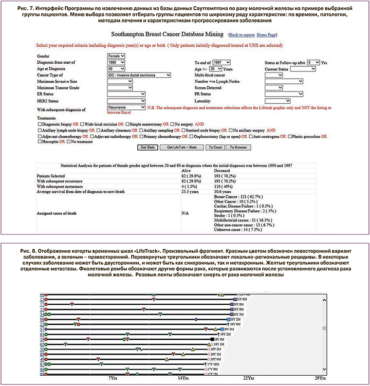 Это побудило нас создать инструмент для извлечения данных, с помощью которого мы могли бы выбирать и определять группы пациентов по различным характеристикам: демографическим, гистологическим, по методам лечения и исходам болезни. А также включать пациентов, у которых впоследствии развились рецидивы или метастазы, в любой временной период за последние 40 лет (рис. 7).
