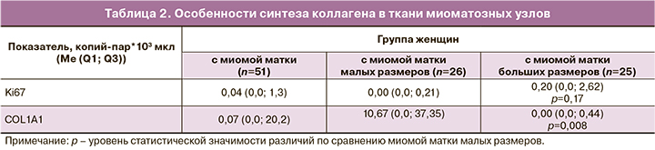 Данные по особенностям синтеза коллагена в миоматозных узлах представлены в табл. 2. В результате проведенного исследования нами выявлено, что миоматозные узлы больших размеров характеризуются повышенной пролиферативной активностью на фоне сниженного синтеза коллагена.