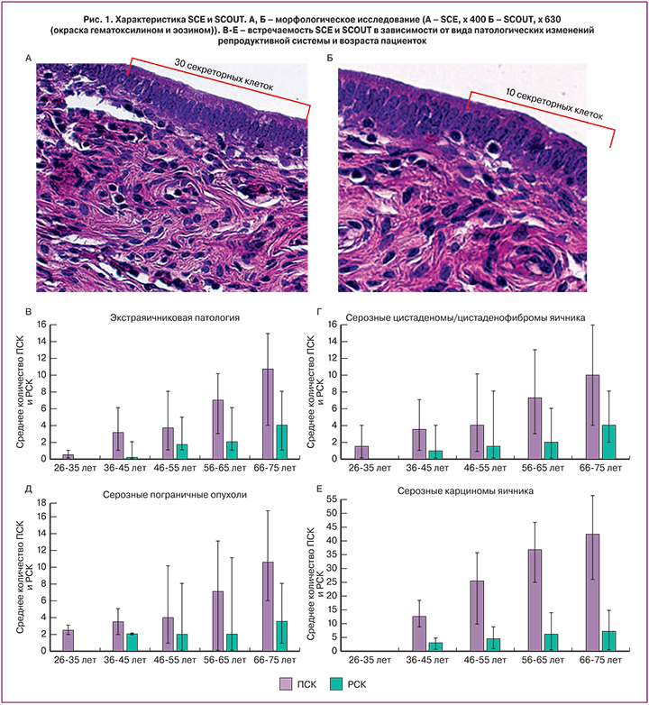 SCE и SCOUT были оценены в маточных трубах пациенток со всеми изучаемыми патологиями репродуктивной системы, которые были разделены на возрастные группы (26–35, 36–45, 46–55, 56–65, 66–75 лет) (рис. 1А и Б).