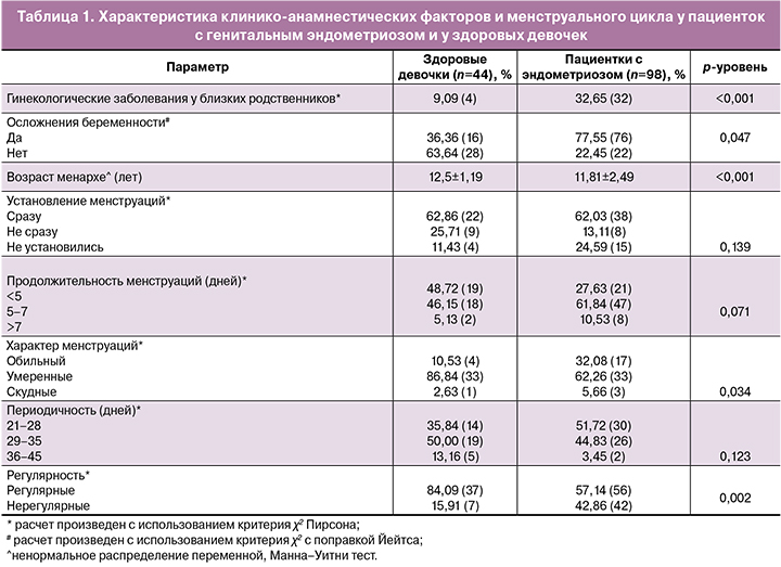 По клинико-анамнестическим данным пациентки основной группы в сравнении со здоровыми девочками значимо чаще характеризовались отягощением наследственности по эндометриозу и другим гинекологическими заболеваниями (миома матки, аномальные маточные кровотечения, гиперплазия эндометрия) у родственников (32/98 (32,7%) против 4/44 (9,1%), р<0,001; χ2-тест). Также в группе пациенток основной группы значимо чаще отмечены осложнения течения беременности у матерей пациенток (угроза прерывания беременности, токсикоз, преэклампсия) в 76/98 (77,6%) в сравнении с 16/44 (36,4%) в группе здоровых девочек (р=0,047, χ2-тест с поправкой Йейтса), что отражено в таблице 1.