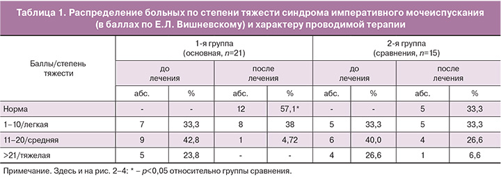 Эффект воздействия усиливался при одновременном тепловом воздействии температурой 43–45°С на мягкие ткани промежности. Возможности аппарата позволяют изменять характер вибрации и температуры в ходе процедуры во избежание адаптации тканей. При этом на ткани осуществляется воздействие переменного и пульсирующего магнитного поля, индукция которого составляла на поверхности аппарата 50±10% мТл. Это соответствовало индукции в области детрузора 5–7 мТл. Минимальный курс лечения составлял 10 ежедневных амбулаторных процедур, стандартный – 15. Продолжительность процедуры постепенно нарастала от начала лечения к концу курса. Статистический анализ проведен с использованием программного пакета Statistics for Windows 10.0 (StatSoft). Для сравнения межгрупповых дисперсий использован дисперсионный анализ при 95% уровне значимости (р<0,05).