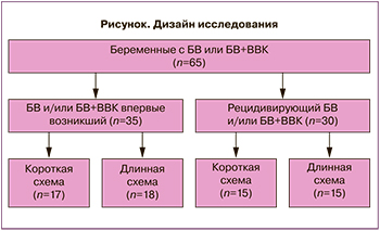 Пациентки были разделены на две группы. Первую группу составили 35 беременных женщин, которым впервые был установлен диагноз БВ или его сочетание с КВВ. Во вторую группу вошли 30 пациенток с диагнозом «рецидивирующий БВ» или его сочетанием с КВВ. Дизайн исследования представлен на рис. 1.
