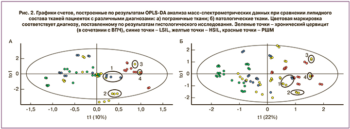 Представляет интерес сопоставление результатов гистологического исследования и липидного профиля исследуемых тканей. На рис. 2 представлены графики счетов OPLS-DA анализа данных отдельно для всех пограничных тканей (рис. 2а) и для всех патологических образцов (рис. 2б). Точки окрашены в соответствии с гистологическим диагнозом: зеленые – хронический цервицит (в сочетании с ВПЧ), синие – LSIL, желтые – HSIL, красные – РШМ. Для нормальных тканей группы точек, соответствующих цервициту (в сочетании с ВПЧ), LSIL и HSIL, пересекаются друг с другом, образуя достаточно равномерный кластер, а точки, соответствующие РШМ, группируются отдельно. Этот факт предполагает значительное отличие липидного состава тканей, граничащих со злокачественной опухолью, от тканей, граничащих с воспалительными и предраковыми поражениями эпителия. В случае патологически измененных тканей в отдельный кластер выделилась большая часть точек, соответствующих хроническому цервициту (рис. 2б). Точки HSIL и РШМ занимают перекрывающиеся участки графика, что свидетельствует о схожести липидного профиля соответствующих им образцов. Обращают на себя внимание выделенные на рис. 2 области 1–4. В области с одинаковыми номерами попали точки образцов, гистологически охарактеризованных как HSIL и LSIL на рис. 2б, и соответствующие им пограничные. Однако по липидному составу как патологические, так и пограничные образцы в указанных областях ближе к РШМ. Особенно ярко это сходство выражено для образцов, точки которых лежат в областях 3, 4.