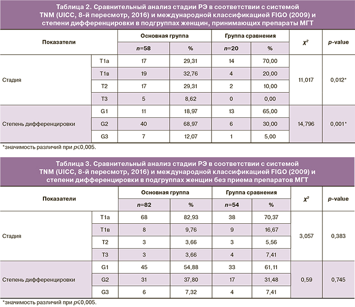 При проведении сравнительного анализа стадии РЭ в соответствии с системой TNM (UICC, 8-й пересмотр, 2016) и международной классификацией FIGO (2009) и степени дифференцировки между подгруппами женщин, в которых был отмечен прием препаратов МГТ, были получены значимые различия (табл. 2).