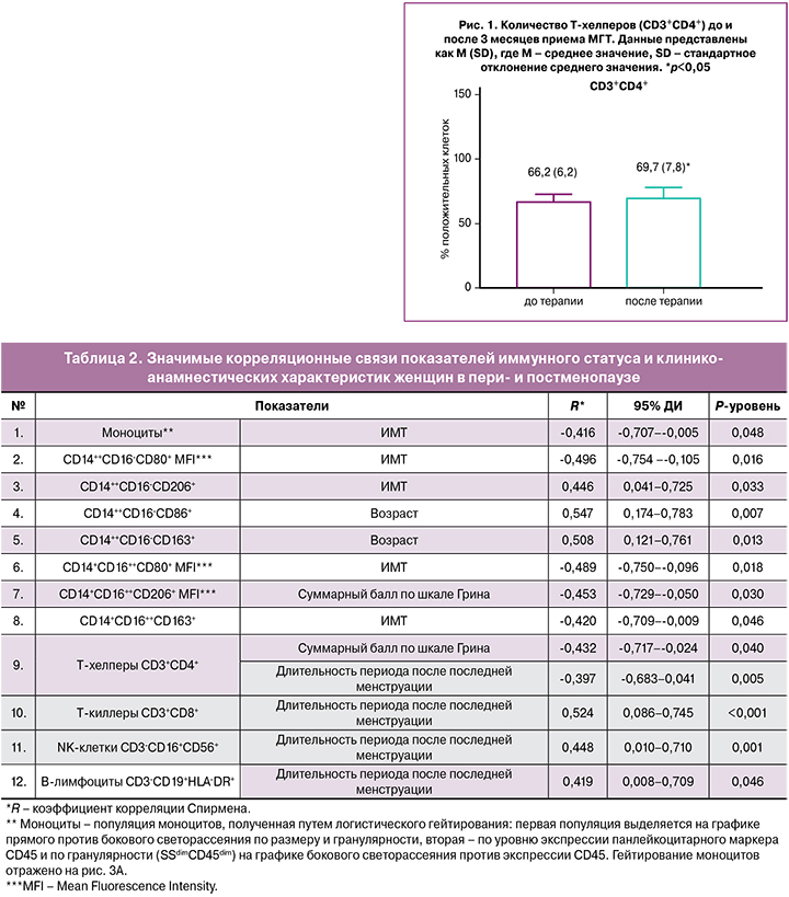 Для 23 женщин, получавших МГТ, было проведено исследование параметров иммунной системы методом проточной цитофлуориметрии: определено количество классических (CD14++CD16‑) и неклассических (CD14+CD16++) моноцитов, общая моноцитарная популяция (CD11b, CX3CR1, HLA‑DR, CD45), оценены уровни экспрессии провоспалительных (CD86, CD80, CD40) и противовоспалительных маркеров (CD163, CD206). Также было проанализировано содержание субпопуляций лимфоцитов периферической крови: T‑, В‑лимфоцитов и NK‑клеток.