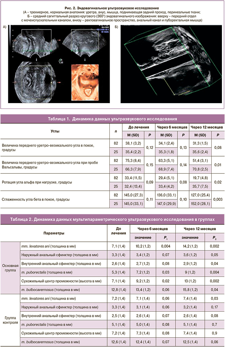 У пациенток основной группы достигнутый положительный результат доказывался (через 6 и 12 месяцев) данными мультипараметрического ультразвукового исследования, что подтверждается статистически значимым результатом изменений показателей толщины mm. levatores ani, m. puborectalis и высоты сухожильного центра промежности. Отмечено улучшение эхоструктуры анатомо-функциональных элементов тазового дна (табл. 2).