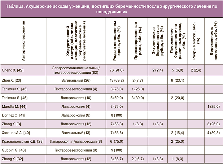 Следует подчеркнуть, что, несмотря на проведенное хирургическое лечение, исследователи регистрируют такие грозные осложнения, как разрыв матки и эктопическая беременность в области рубца, а также placenta previa и placenta accreta [3, 23, 28, 32, 40–42, 44–46]. На сегодняшний день не существует исследований, сравнивающих эффективность хирургических подходов с точки зрения акушерских и гинекологических исходов, как нет и рекомендаций по выбору хирургической тактики для женщин с признаками несостоятельного рубца на матке, планирующих беременность. Вместе с тем необходимо отметить, что родоразрешать женщин, прошедших хирургическое лечение по поводу «ниши», большинство авторов рекомендуют путем операции планового КС в сроке не позднее 38–39 недель гестации [12, 44].