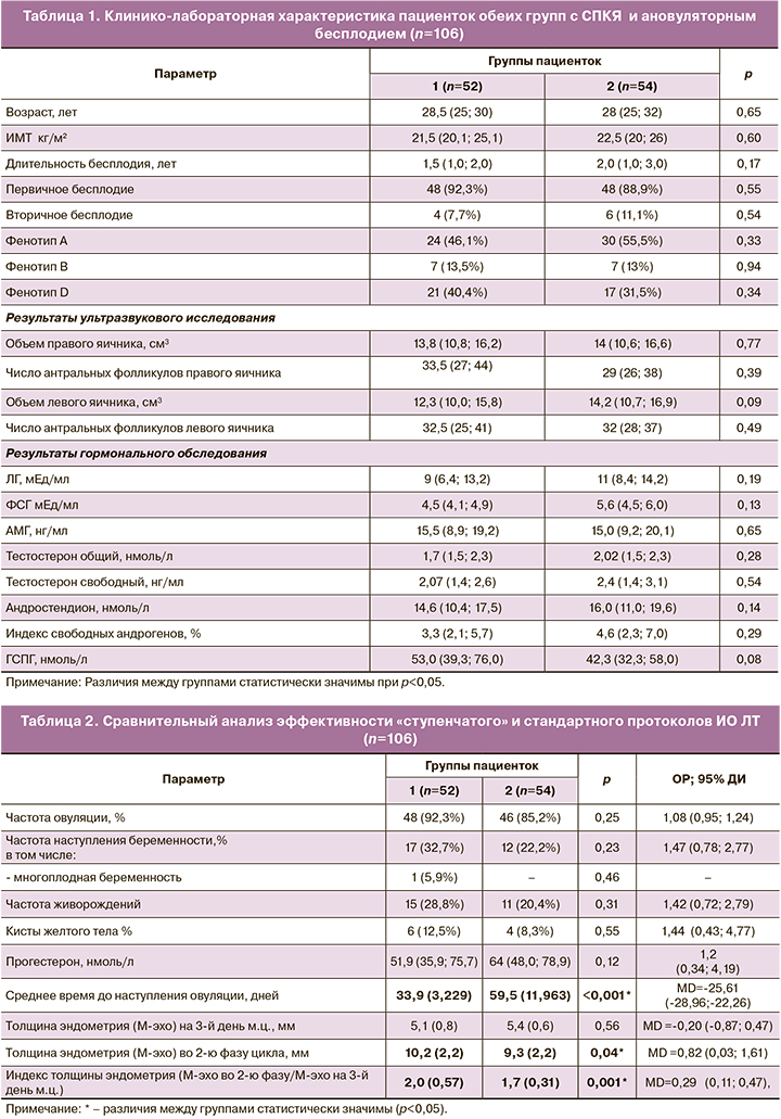 С целью ИО исходно все женщины получали ЛТ (препарат «Фемара» 2,5 мг, Novartis) в дозе 2,5 мг/сутки с 3-го по 7-й день спонтанного или индуцированного микронизированным прогестероном менструального цикла. По результатам фолликулометрии в 88/194 (45,4%) случаев размеры фолликула превышали 10 мм, и эти пациентки не были включены в дальнейшее исследование. Не «ответившие» на стартовую дозу ЛТ 106/194 (54,6%) женщин были случайным образом разделены на 2 группы в зависимости от используемого протокола стимуляции: 1-ю группу составили 52 пациентки, которым был предложен «ступенчатый» протокол, 2-ю группу – 54 пациентки, которым ИО проводилась по стандартному протоколу. Для случайного распределения участниц исследования в группы использовалась простая рандомизация методом конвертов. Процедуры ослепления в данном исследовании не проводилось.
