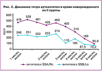 Отмеченное в нашей работе снижение титра Ro/La-антител в крови новорожденных в динамике за первые 6 месяцев жизни доказывает их трансплацентарный переход и подтверждается литературными данными о том, что данный вид ФБ является моделью пассивно приобретенного аутоиммунного заболевания [10].