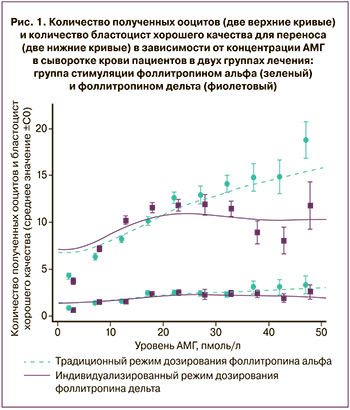 Женщины распределялись случайным образом в соотношении 1:1 в зависимости от сывороточной концентрации АМГ: группа с низким значением АМГ (<15 пмоль/л) и группа с высоким значением АМГ (>15 пмоль/л). Ежедневная дозировка фоллитропина дельта составляла 12 мкг/сут в группе с низким значением АМГ и 0,10–0,19 мкг/кг/сут в зависимости от массы тела и концентрации АМГ в группе пациенток с высоким уровнем гормона. Стимуляция продолжалось от 6 до 12 дней, в контрольной группе пациенткам подкожно ежедневно вводили фоллитропин бета в дозировке 150 МЕ/сут в течение первых 5 дней, после чего дозировку могли корректировать с шагом 75 МЕ и максимально допустимой дозой 375 МЕ/сут.