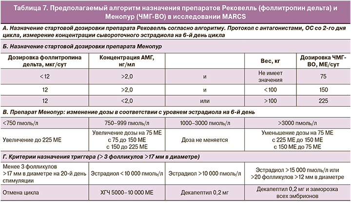 Все участницы исследования ежедневно получали индивидуальную дозировку фоллитропина дельта подкожно, рассчитанную по алгоритму в зависимости от массы тела и сывороточной концентрации АМГ, а также ЧМГ-ВО (Менопур): 75 МЕ/сут при дозе фоллитропина дельта ниже 12 мкг, 150 МЕ/сут при дозе фоллитропина дельта 12 мкг и массе тела менее 100 кг и 225 МЕ/сут ЧМГ-ВО вводили пациенткам с массой тела более 100 кг (табл. 7). Стимуляцию начинали со 2-го дня цикла и на 6-й день оценивали ее эффективность по количеству растущих фолликулов и сывороточной концентрации эстрадиола. В зависимости от уровня эстрадиола могла быть скорректирована дозировка ЧМГ-ВО с 6-го дня стимуляции при максимально допустимой дозировке 225 МЕ/сут. Триггер овуляции назначался при наличии трех и более фолликулов с диаметром от 17 мм. В качестве триггера вводился препарат ХГЧ в дозировке 5000–10 000 МЕ при концентрации эстрадиола менее 10 000 пмоль/л или агонист ГнРГ в дозировке 0,2 мг при больших значениях сывороточного эстрадиола. В качестве контрольной группы использовались данные из исследования ESTHER-1.