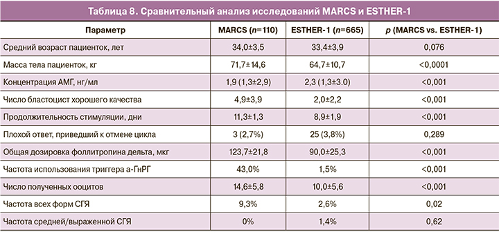 Сравнение основных показателей исследований ESTHER и MARCS показало, что в исследовании ESTHER пациентки были более молодыми и с более высоким уровнем АМГ, что, вероятно, стало причиной более высоких дозировок (общей и стартовой) фоллитропина дельта у пациенток в исследовании MARCS. В частности, максимально допустимая доза фоллитропина дельта (12 мкг/сут) в исследовании MARCS была назначена в 71% случаев, а также отмечалась более длительная продолжительность стимуляции и более высокая частота замены триггера. В то же время в исследовании MARCS было большее число полученных ооцитов и бластоцист. Интересно, что в отличие от исследования ESTHER-1 случаев СГЯ средней или тяжелой степени тяжести при применении комбинированного протокола Рековелль и Менопур отмечено не было (табл. 8).