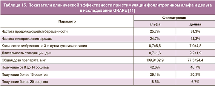 Средняя продолжительность стимуляции в группах приема фоллитропинов альфа и дельта составила 8,7±5,5 и 7,0±4,8 дня соответственно, с общей дозой препаратов 109,9±2,9 мкг (фоллитропин альфа) и 77,5±24,4 мкг (фоллитропин дельта) (табл. 15). Желаемый эффект по количеству полученных ооцитов (от 8 до 14 ооцитов) достигнут в 42,6 и 46,7% случаев при стимуляции фоллитропинами альфа и дельта соответственно. У женщин с риском развития СГЯ (с концентрациями АМГ >5 пмоль/л) после стимуляции фоллитропином альфа на пункции получали более 15 и 20 фолликулов в 39,1 и 18,5% соответственно; при стимуляции фоллитропином дельта – в 20,2 и 6,7% соответственно. Полученные данные коррелируют с результатами предыдущих исследований ESTHER-1 и STORK, которые показывают эффективность индивидуального расчета дозировки фоллитропина у пациентов с риском СГЯ. В ходе исследований ранняя степень СГЯ без обращения за медицинской помощью выявлена у 4,0% в группе приема фоллитропина дельта и 6,5% – в группе приема фоллитропина альфа; с превентивными мерами – 5,0 и 9,6% соответственно.