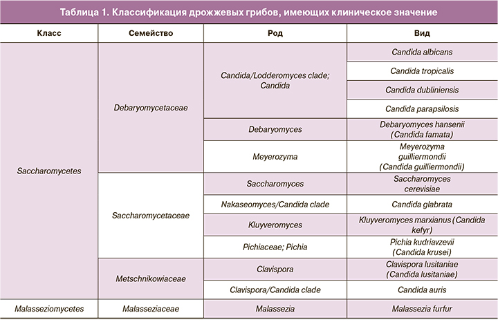 На основании данных о структуре генома, полученных с использованием новых молекулярно-генетических методов, классификация дрожжевых грибов в последние годы активно пересматривается. В результате некоторые виды, ранее относившиеся к роду Candida, поменяли свою принадлежность, и в настоящее время их относят к другим родам (табл. 1). Соответственно, были изменены и названия этих видов (устаревшие названия приведены в скобках), которые уже не называются Сandida. Таким образом, в настоящее время «дрожжеподобные грибы рода Candida» представляют собой собирательное название дрожжевых грибов, относящихся к разным родам и не всегда являющихся Candida.