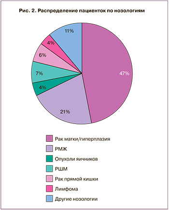 Были определены основные нозологические формы онкологических заболеваний у пациенток, направленных для предварительного сохранения репродуктивного материала. Результаты анализа представлены на рис. 2. Наиболее частыми нозологиями были рак матки I степени и атипическая гиперплазия эндометрия (n=22), рак молочной железы (n=10). Остальные заболевания: пограничные опухоли яичников (после выполнения оперативного лечения и гистологической верификации диагноза), рак шейки матки, рак прямой кишки, лимфомы, рак щитовидной железы, составили суммарно 15 случаев.