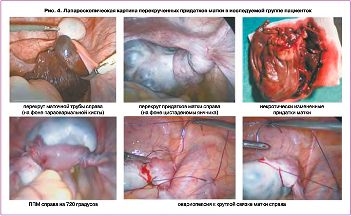 4. По данным лапароскопической картины в 27,6% случаев наблюдался тугой перекрут с признаками нарушения кровотока придатков матки, в 72,4% – нетугой перекрут с сохранением физиологической окраски тканей; в 89,7% случаев произведена деторсия придатков матки, в 6,9% наблюдений в связи с полным некрозом – аднексэктомия; у 20,7% пациенток органосохраняющая операция дополнена овариопексией и укорочением воронко-тазовых связок.
