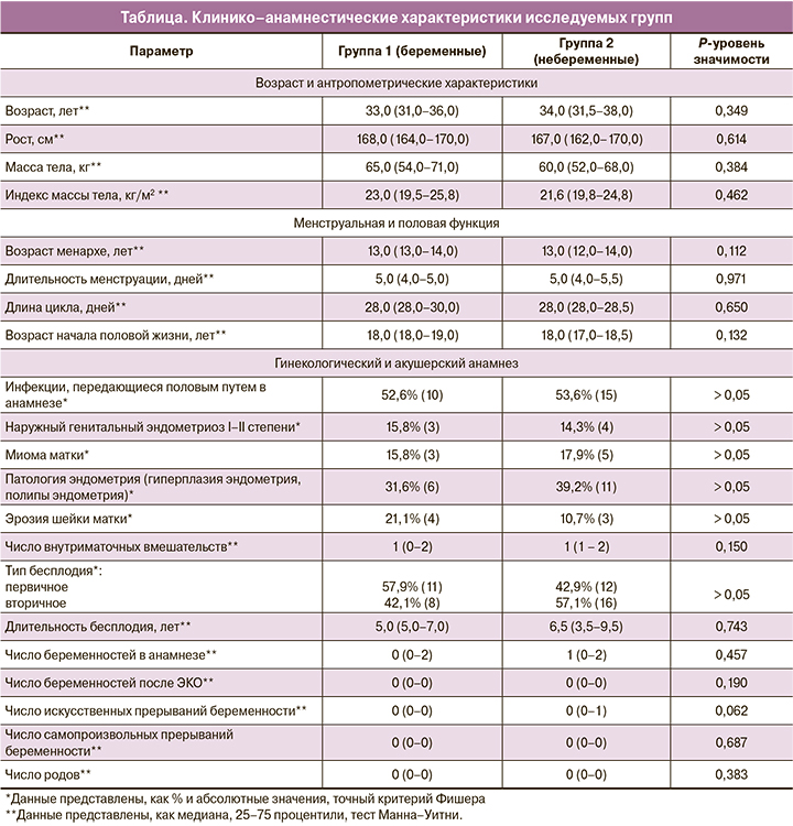 В зависимости от исхода следующей после проведения пайпель-биопсии программы ЭКО пациентки были разделены на 2 группы: группа 1 – пациентки, у которых беременность наступила; группа 2 – пациентки, у которых беременность не наступила. На основании критерия Колмогорова–Смирнова выявлено, что возраст и антропометрические данные пациенток в исследуемых группах подчинялись закону нормального распределения (p>0,05), однако, учитывая небольшой объем выборки для каждой из групп, мы применяли здесь и далее непараметрические методы расчета. Тест Манна–Уитни не выявил статистически значимых различий по возрасту, росту, массе тела и, как следствие, по индексу массы тела между исследуемыми группами (таблица).
