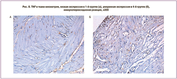 TNF (рис. 7) экспрессировался в виде коричневого окрашивания в децидуальной ткани, лейомиоцитах, эндотелии сосудов. В группе кесарева сечения с преждевременным излитием вод, без регулярной родовой деятельности 4(Р-В+) накопление TNF было максимальным, 1 и 2 балла соответственно (рис. 8).