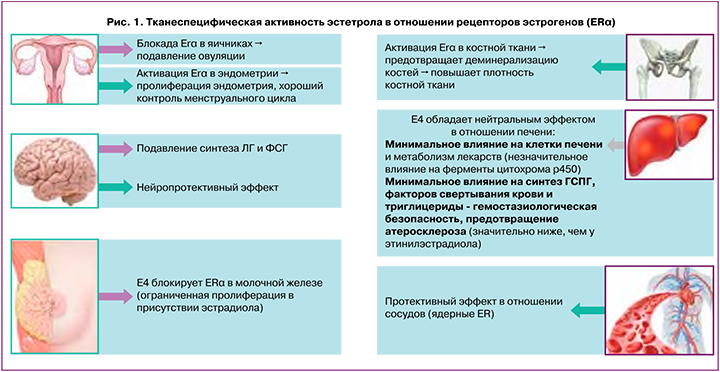 Все эстрогены связываются с двумя субпопуляциями альфа-рецептора эстрогена (ERα): ядерными ERα, которые индуцирует транскрипцию генов, и мембранными ERα, которые инициируют быструю передачу сигналов. Эстетрол активирует ядерные рецепторы эстрогенов, однако, в отличие от других эстрогенов, эстетрол противодействует активности мембранных рецепторов эстрогенов. Благодаря такому избирательному действию на ткани эстетрол способен подавлять овуляцию за счет блокады ERα в яичниках, связываться с мембранными ERα в молочной железе и ограничивать нежелательные процессы клеточного роста и деления в этом органе. Одновременно эстетрол за счет активации ядерных ERα предотвращает деминерализацию костей, оказывает нейропротективный и защитный эффекты в отношении кровеносных сосудов. Эстетрол обладает нейтральным эффектом в отношении печени, что крайне важно с точки зрения тромботической безопасности этого эстрогена (рис. 1).