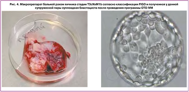 На рисунке 4 представлены макропрепарат больной раком яичника стадии Т3сNxM1b согласно классификации FIGO и полученная у данной супружеской пары эуплоидная бластоциста после проведения программы OTO IVM.