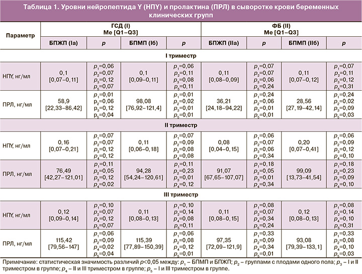 Результаты исследования показали, что уровень НПY довольно постоянен на протяжении всей беременности и ни пол плода, ни состояние углеводного обмена не влияют на его продукцию. Однако они являются определяющими в секреции ПРЛ. В I триместре установлено статистически значимое преобладание его уровня в I группе у БПМП на 40,1% в сравнении с БПЖП, а также у БПМП в I группе (на 70,9%) относительно группы контроля. Для всех беременных было характерно статистически значимое увеличение его уровня к родам (табл. 1).