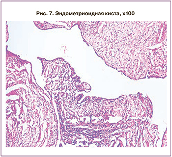 В сроке беременности 14 недель 06.12.2018 пациентка поступила в частную клинику г. Ростова-на-Дону с жалобами на постоянные тянущие боли внизу живота. Заключение по данным бимануального осмотра и УЗИ: беременность 14 недель, риск низкой плацентации, опухоль левого яичника. Учитывая жалобы и размеры образования, была выполнена лапароскопия с удалением опухоли левого яичника. По данным гистологического анализа: эндометриоидная киста, кистозный вариант (рис. 7).