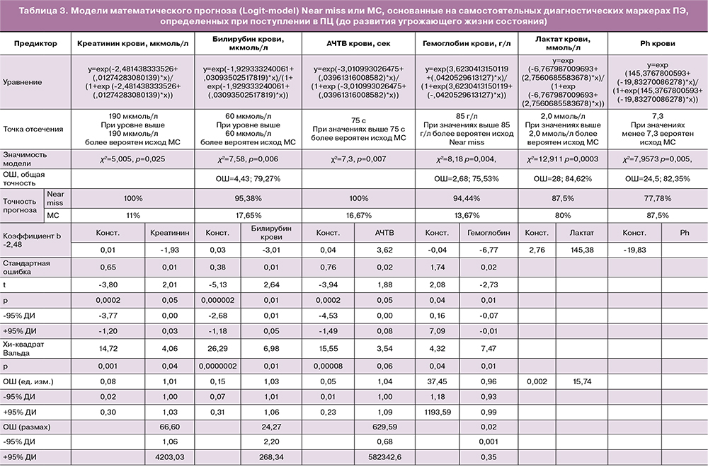 На основании отдельных параметров (предикторов) при помощи логистической регрессии (Logit-model) установлены «точки отсчета» бинарного исхода угрожающего жизни состояния (Near miss или МС) (табл. 3). Модель на основании протеинурии оказалась незначимой (χ2=0,81, p=0,37).