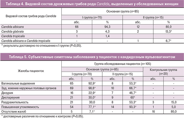 Видовой состав дрожжевых грибов рода Candida у пациенток с монокандидозной (I группа) и сочетанной кандидозно-бактериальной инфекцией (II группа) представлен в табл. 4, из которой видно, что возбудителями КВВ у 66 (94,3%) пациенток I группы и у 12 (80%) пациенток II группы были грибы рода Candida albicans. В то же время при сочетанной кандидозно-бактериальной инфекции отмечается достоверное повышение частоты встречаемости видов non-albicans во II группе (20%) по сравнению с I группой (5,7%) (Р<0,05).