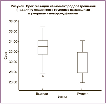 Все включенные в исследование женщины с ЗРП были родоразрешены преждевременно, в среднем в 32,3 (2,3) недели беременности (М (SD)) (рисунок). Срок гестации на момент родов в группе с умершими детьми составил 30,0 (2,3) недели, в группе с пережившими неонатальный период – 32,8 (2,0) недели, статистически значимых различий по сроку родов выявлено не было (p=0,37).