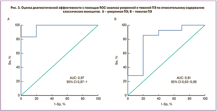 Содержание классических, промежуточных и неклассических субпопуляций моноцитов в процентах от общего количества моноцитов для контрольной группы, умеренной ПЭ и тяжелой ПЭ представлены на рис. 2. В группах пациентов с умеренной и тяжелой ПЭ наблюдалось снижение классических CD16-негативных моноцитов по сравнению с контрольной группой в периферической крови (рис. 2, А). Причем в группе с тяжелой ПЭ содержание классических моноцитов было ниже, чем в группе с умеренной ПЭ. Таким образом, было показано, что относительное содержание классических CD16-негативных моноцитов в периферической крови имеет обратную корреляцию с тяжестью ПЭ. Содержание классических моноцитов в контрольной группе составило 56,55 (45,3;12,6)%, у женщин с умеренной ПЭ – 40,65 (34,2;60,8)%, р=0,01, у женщин с тяжелой ПЭ – 17,4 (53,2;19,5)%, р=0,001 (рис. 2, А). При этом ROC-анализ показал хорошую диагностическую ценность при сравнении группы контроля с группой с умеренной ПЭ – AUC=0,81 (95% ДИ 0,63–0,98), чувствительность 86%, специфичность 80%, и отличную диагностическую ценность при сравнении группы контроля с группой с тяжелой ПЭ – AUC=0,96 (95% ДИ 0,87–1), чувствительность 83%, специфичность 100% (рис. 3). Содержание промежуточных и неклассических моноцитов в периферической крови было повышено в группах с умеренной и тяжелой ПЭ. В случае неклассических моноцитов их содержание в периферической крови составило: в контрольной группе – 12,65 (20,4; 22,7)%, у женщин с умеренной ПЭ – 16,05 (12,6; 16,7)%, с тяжелой ПЭ – 26,05 (8,9; 44,7)%; в случае промежуточных моноцитов – 31,45 (50,3; 39,2)%, 40,3 (32,2; 39)%, 49,2 (25; 56,6)% по группам соответственно. Однако статистически значимые различия наблюдались только при сравнении тяжелой ПЭ с контрольной группой в обеих субпопуляциях (неклассических и промежуточных) моноцитов (рис. 2, Б, В).