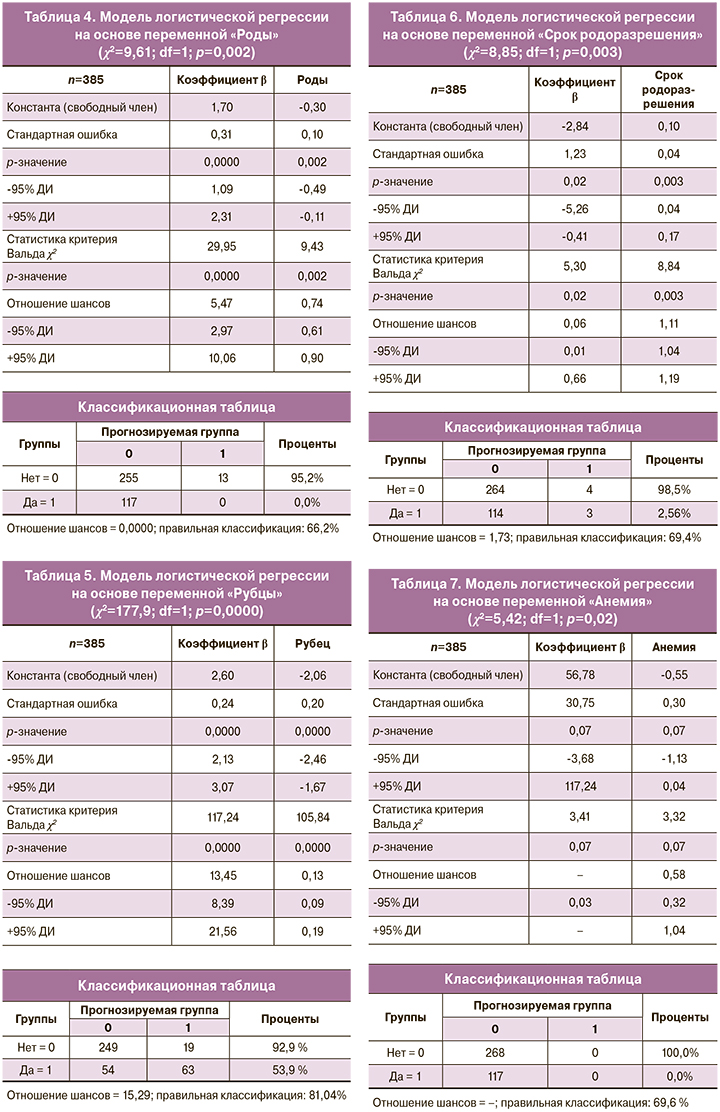 Результаты двух предыдущих методов по отбору предикторов среди всех изученных переменных подтверждались и в процессе проведения логистической регрессии, хотя полного совпадения не было. Установлено, что из всех отобранных при классификационной модели деревьев и ROC-анализе переменных реальными предикторами могли в той или иной степени быть только четыре: 1) количество рубцов, 2) количество родов, 3) срок родоразрешения и 4) наличие анемии. Именно на их основе были созданы простые однокомпонентные модели классификации беременных без приращения и с приращением предлежащей плаценты (табл. 4−7). Однако модель с анемией, несмотря на статистическую значимость (χ2=5,42; p=0,02), была исключена из дальнейшего сравнения (по показателю отношения шансов) (табл. 7).