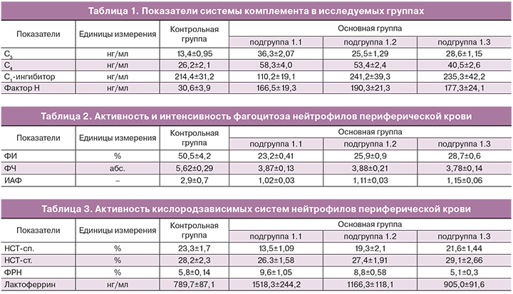 Содержание С3, С4-компонентов комплемента, фактора Н, С1-ингибитора определяли в плазме с помощью набора реагентов ProCon (ООО «Протеино­вый контур», г. Санкт-Петербург) методом твердофазного иммуноферментного анализа.