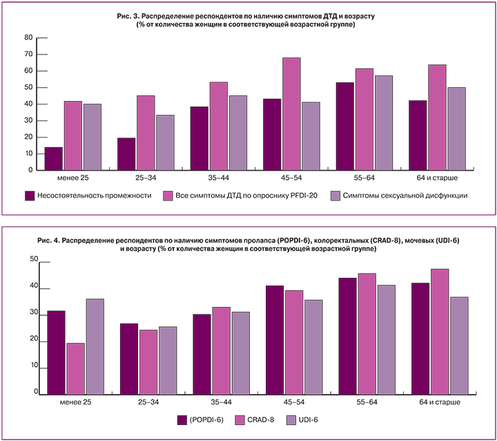 Частота ДТД увеличивалась пропорционально возрасту, о чем свидетельствуют также и другие публикации [4–6]. Несколько более высокий уровень ДТД выявлен в возрасте младше 25 лет по сравнению с 25–34. Это может говорить о влиянии беременности и родов, в результате которых, как известно, страдают структуры тазового дна [7, 8].