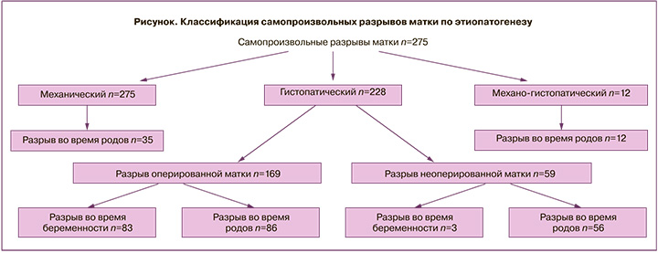 Классификация самопроизвольных РМ по этиопатогенезу на основании изученных 275 историй родов, сопровождавшихся РМ, в г. Москве с 1997 по 2018 гг. представлена на рисунке.
