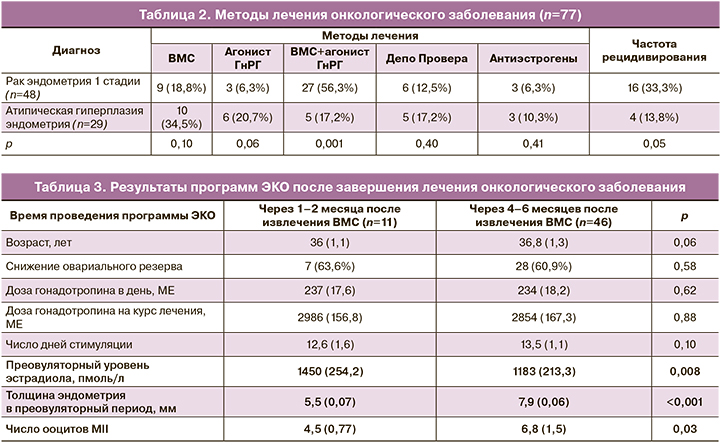 Особенностью явилось то, что решение следовало принять уже при первой консультации больных и времени на предварительное обследование пациенток не предоставлялось. Всего в период с октября 2018 г. по август 2019 г. на консультацию были направлены 77 пациенток в возрасте от 25 до 50 лет, средний возраст составил 36,6 (2,8) года. РТМ I стадии выявлен у 48 женщин, атипическая гиперплазия эндометрия – у 29 пациенток. После оценки состояния репродуктивной системы у 8 пациенток вследствие позднего возраста и резкого снижения показателей овариального резерва были признаны нецелесообразными предварительная консервация репродуктивного материала или проведение программ, направленных на реализацию репродуктивной функции после окончания лечения. 11 женщинам в возрасте от 24 до 36 лет были рекомендованы лечение основного заболевания, повторная консультация после его завершения и достижения стойкой ремиссии. Подобное решение обусловлено следующими аргументами: молодой возраст, поликистозные яичники по данным ультразвукового исследования и высокие показатели овариального резерва, выраженные эндокринно-метаболические нарушения, отсутствие полового партнера, ориентированность на отсроченное деторождение. Всего программы ЭКО проведены у 41 женщины; у 4 – стимуляция овуляции, забор и криоконсервация ооцитов/эмбрионов для отсроченной реализации репродуктивной функции, после чего начата терапия основного заболевания; у 4 женщин произведена стимуляция овуляции с последующим забором и криоконсервацией репродуктивного материала в процессе лечения. У 31 пациентки проведена программа ЭКО с переносом эмбриона в «свежем цикле» после завершения лечения онкологического заболевания, у 2 – перенос ранее консервированных эмбрионов.