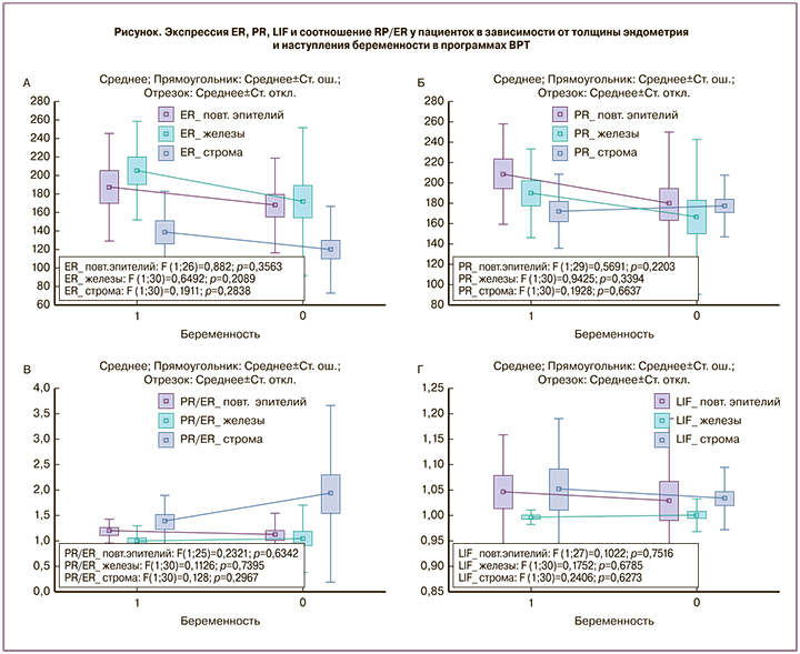 В нашем исследовании также отмечалось хотя и не значимое, но повышение экспрессии ER у забеременевших пациенток и у пациенток с нормальной толщиной эндометрия. Самые низкие показатели экспрессии ER были выявлены у пациенток с «тонким» эндометрием, у которых беременность не наступила. Данная тенденция была обнаружена как в эпителиальном, так и в стромальном компоненте эндометрия.