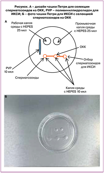 Во всех случаях оплодотворения использовали собственные ОКК пациентки. За 1 ч до процедуры ИКСИ готовили чашку Петри, показанную на рисунке. Использовали среду, содержащую HEPES (Gamet Buffer, COOK, Ирландия). Собранные ОКК помещали в область центральной капли, обработанные сперматозоиды – в крайнюю левую каплю (рисунок).