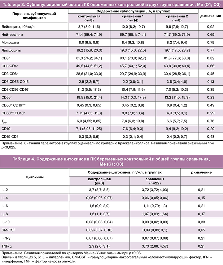 Также представлен анализ содержания цитокинов в ПК обследованных женщин как в общей группе сравнения (табл. 4), так и с учетом двух групп сравнения (табл. 5).