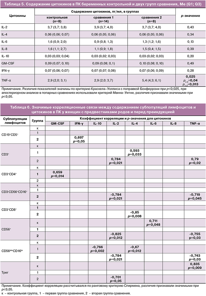 Цель исследования: изучить субпопуляционный состав клеток и содержание цитокинов в периферической крови (ПК) женщин перед спонтанными и индуцированными родами.