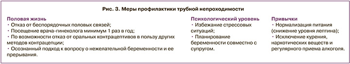 Принимая во внимание непроходимость маточных труб как результат действия различного рода факторов и данные об эмоциональном стрессе, угнетающем бездетную женщину, мы ощутили необходимость просвещения девушек в вопросе заблаговременного поддержания фертильности, сформировав для них правильные мотивации. Для женщины, как продолжательницы рода, будущей жены и матери особенно важным является уважение к своему здоровью, основой чего является знание мер профилактики заболеваний репродуктивной системы задолго до беременности. Большинство рисков развития непроходимости маточных труб женщина способна предотвратить, а некоторые совершенные ошибки в ведении своего образа жизни – исправить. На основе данных медицинской литературы мы установили основные превентивные меры, которые помогут предупредить развитие ряда патологий органов половой системы и оказать благоприятное воздействие на зачатие и течение беременности (рис. 3).