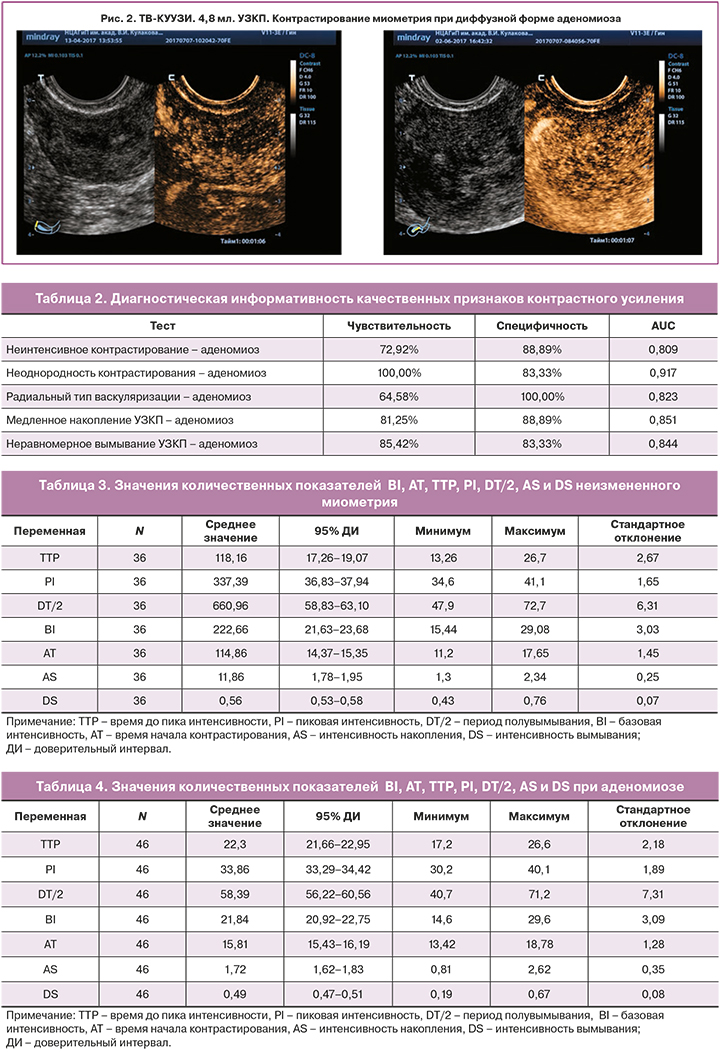 С целью повышения диагностической информативности ТВ-КУУЗИ были оценены количественные параметры кривых «время–интенсивность». Выделены значения количественных показателей, характерные для неизмененного миометрия и аденомиоза. Результаты представлены в таблицах 3 и 4.