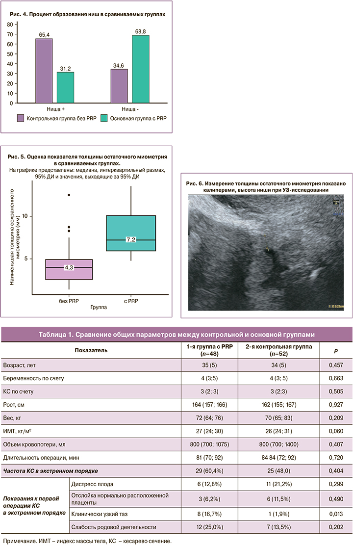 Несмотря на несколько публикаций о влиянии PRP на регенерацию миометрия после кесарева сечения, целостность рубца и RMT после метропластики при врастании плаценты не исследовали ни в одной работе. В настоящем исследовании мы оценили эффективность и безопасность PRP в отношении целостности и толщины рубца на матке. Наши результаты показали благоприятное влияние инъекционного введения PRP в область рубца на матке после метропластики на целостность и толщину рубца. В группе вмешательства было зарегистрировано меньшее количество ниш с меньшим количеством осложнений и большей RMT, по сравнению с контрольной группой. В настоящем исследовании образование ниш в группе, получавшей PRP, составило почти одну треть от контрольной группы, и это различие было статистически значимым. Не было зарегистрировано никаких побочных эффектов от инъекции PRP в исследуемой популяции [23].