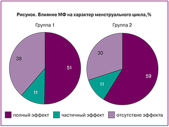 Восстановление регулярного ритма менструаций было достигнуто примерно у каждой 2-й пациентки, независимо от фенотипа СПКЯ, частичный эффект (увеличения числа менструаций) – у каждой десятой пациентки (рисунок). Терапия оказалась неэффективной у 38% пациенток 1-й группы и у 30% – 2-й (р>0,05).