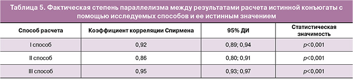 Определенный интерес представляет не только оценка погрешности, но и определение фактической степени параллелизма между результатами расчета истинной конъюгаты с помощью исследуемых способов и ее истинным значением, определенным с помощью ультразвуковой пельвиометрии (табл. 5).
