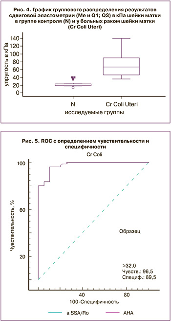 Ретроспективная обработка результатов ультразвуковой эластометрии проводилась при помощи программы MedCalc v.7.4 с использованием непараметрической статистики (медианы (Me) и квартилей Q1 и Q3 (Q1;Q3). Оценку разницы результатов осуществляли по методу Манна–Уитни и считали ее статистически значимой при Р<0,05. Для определения пороговых значений упругости очагов рака шейки матки был проведен ROC-анализ с определением чувствительности, специфичности, прогностической ценности положительного и отрицательного результатов, а также площади под кривой (AUROC).